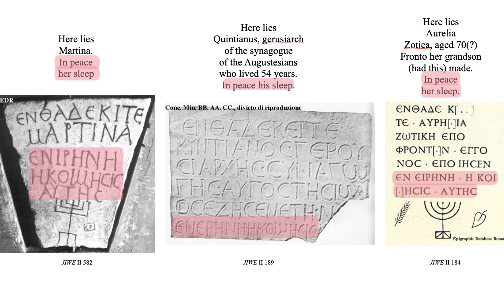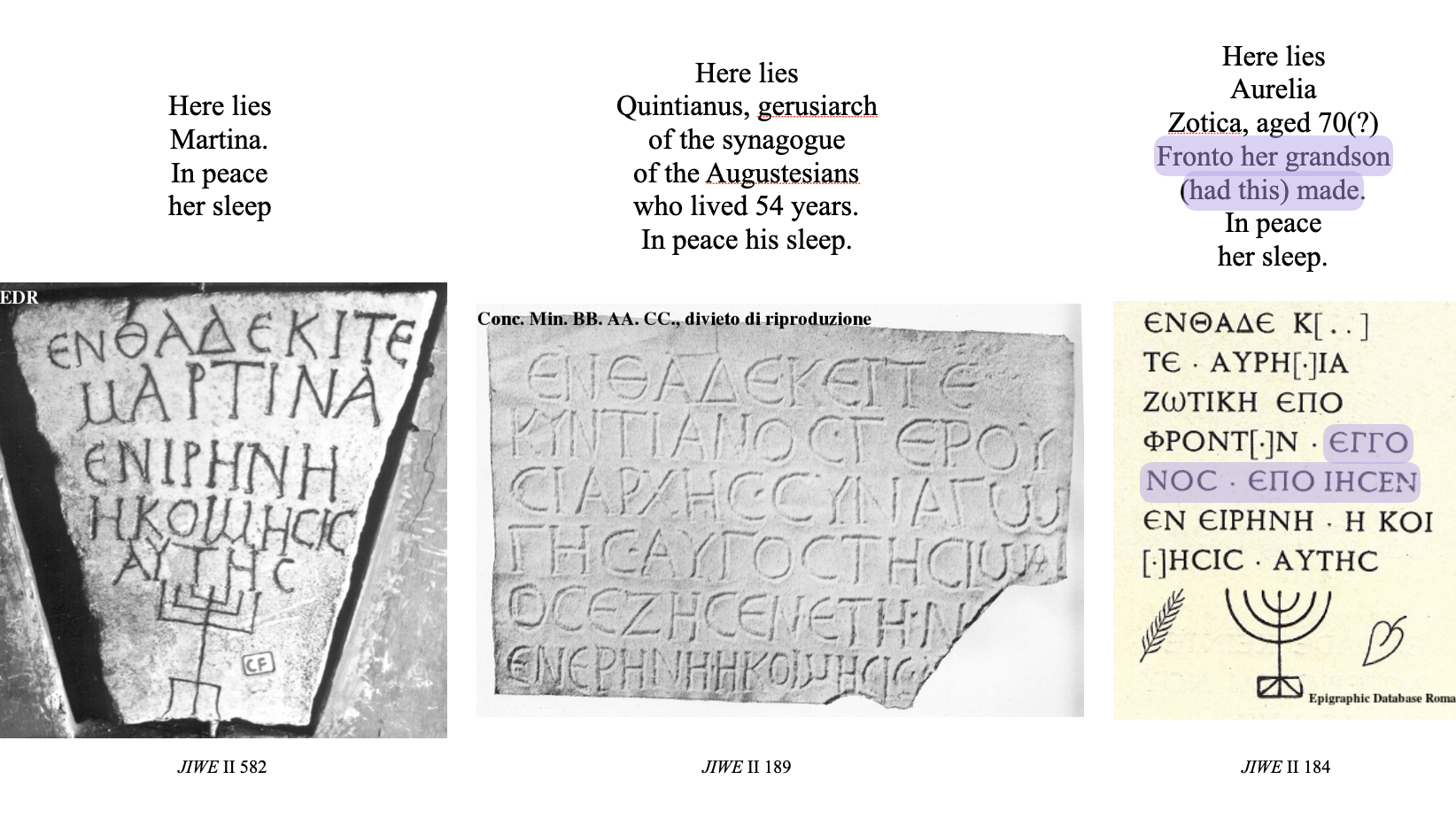 While many medieval Latin Christian inscriptions begin with “here in peace rests”, this group of Jewish inscriptions tend to end with the formula “in peace his/her/your sleep” in Greek, “ἐν εἰρήνῃ κοίμησίς σου”. In the next section, we will look at three inscriptions from David Noy’s edition of Jewish Inscriptions of Western Europe, vol. II (Rome), [henceforth “JIWE II”] nos. 112, 276, 307, which all end in this formula.