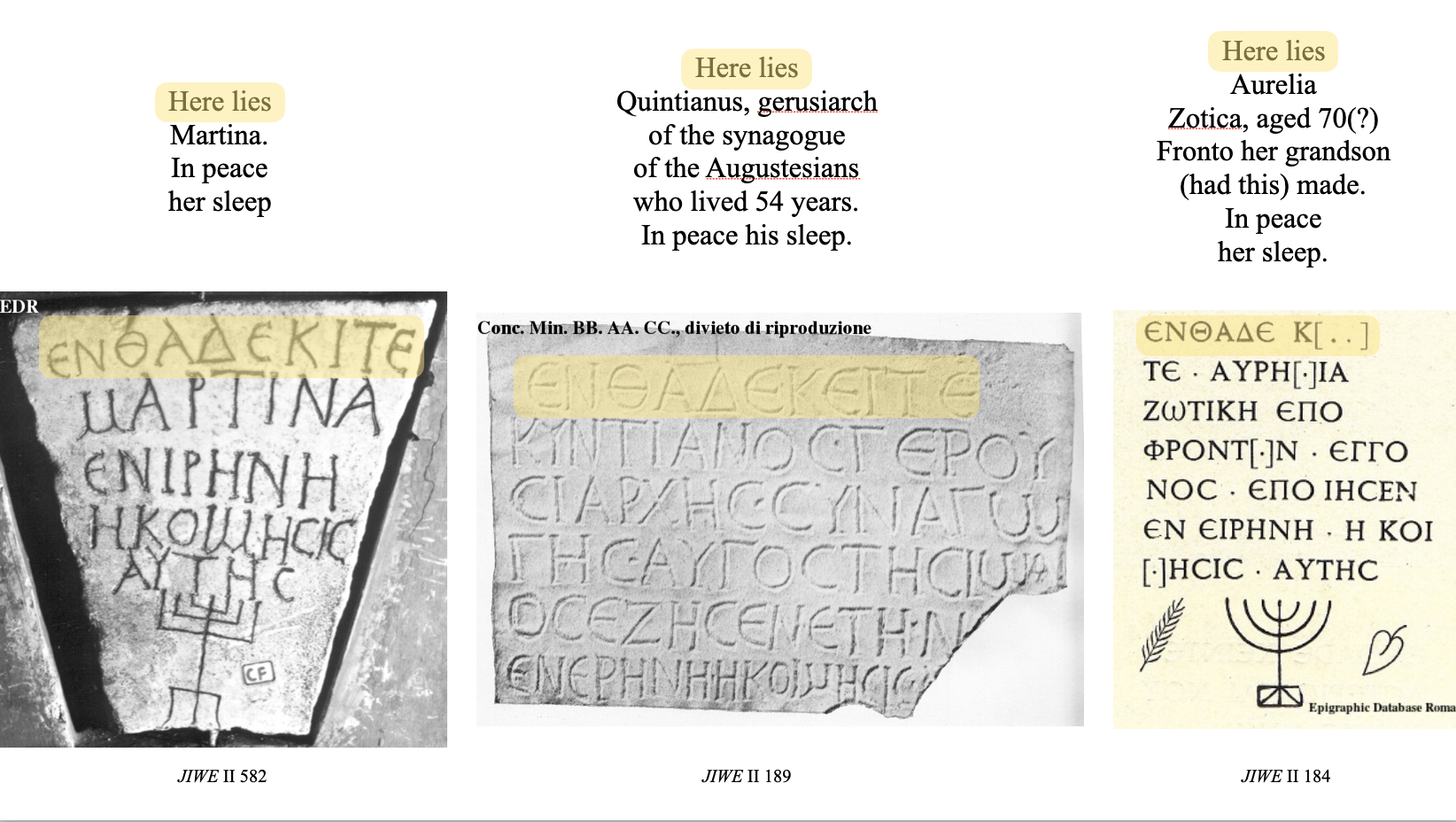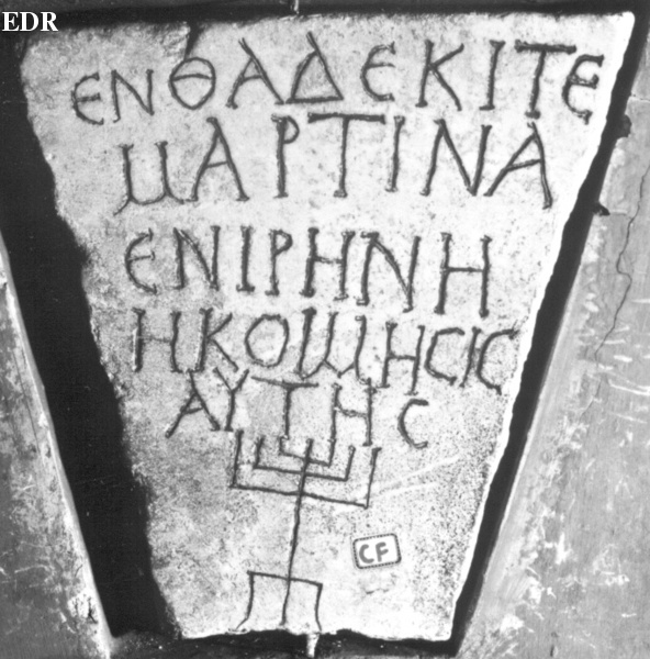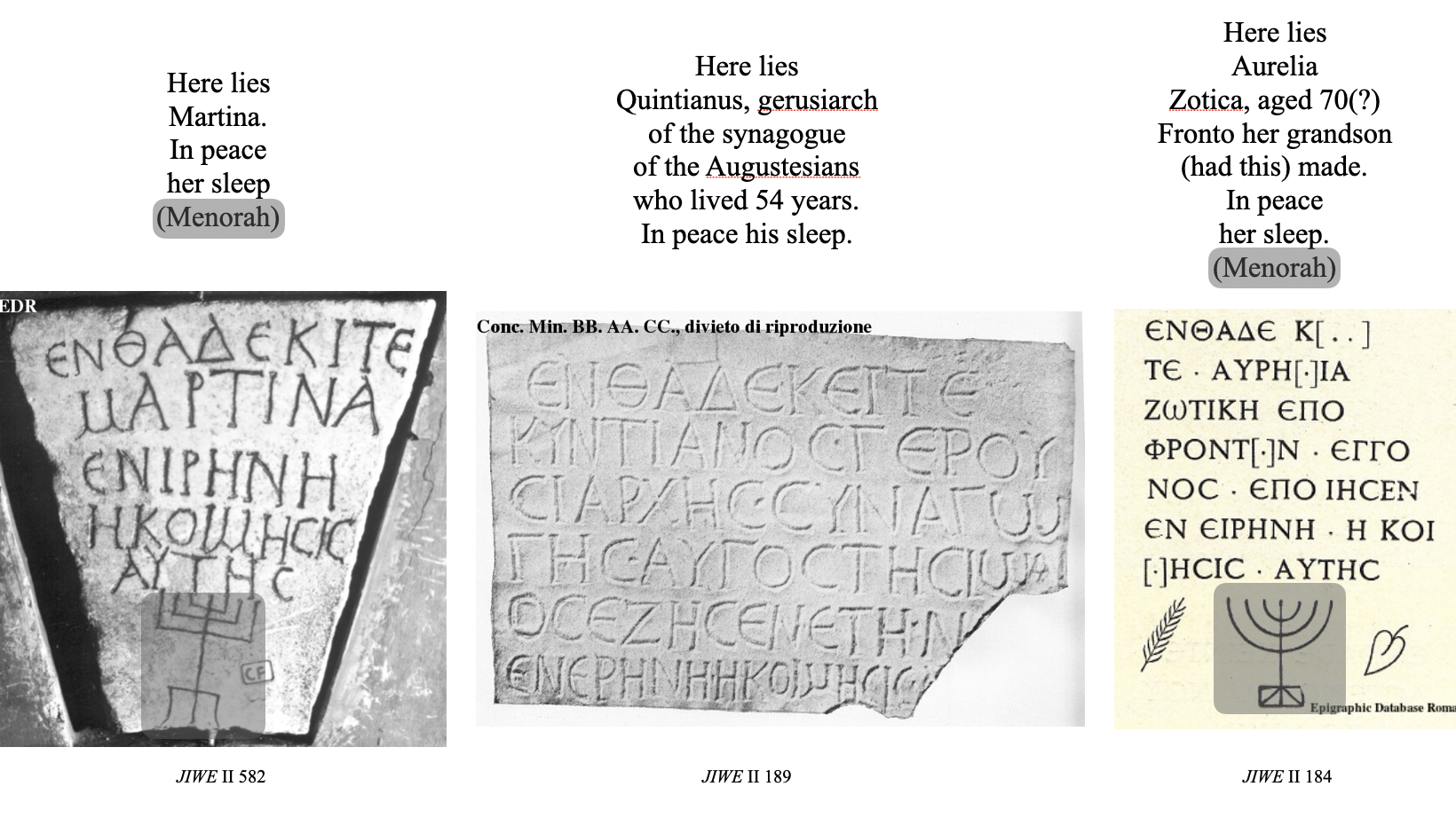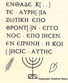 These Jewish inscriptions, almost all from the catacombs (underground cemeteries) in Rome, generally all start with the formula “Here lies”, “Ἐνθάδε κ(ε)ῖτε”, followed by the name of the deceased, and then the “in peace his/her/your sleep” formula. At the bottom, there may be a picture, most commonly a menorah.