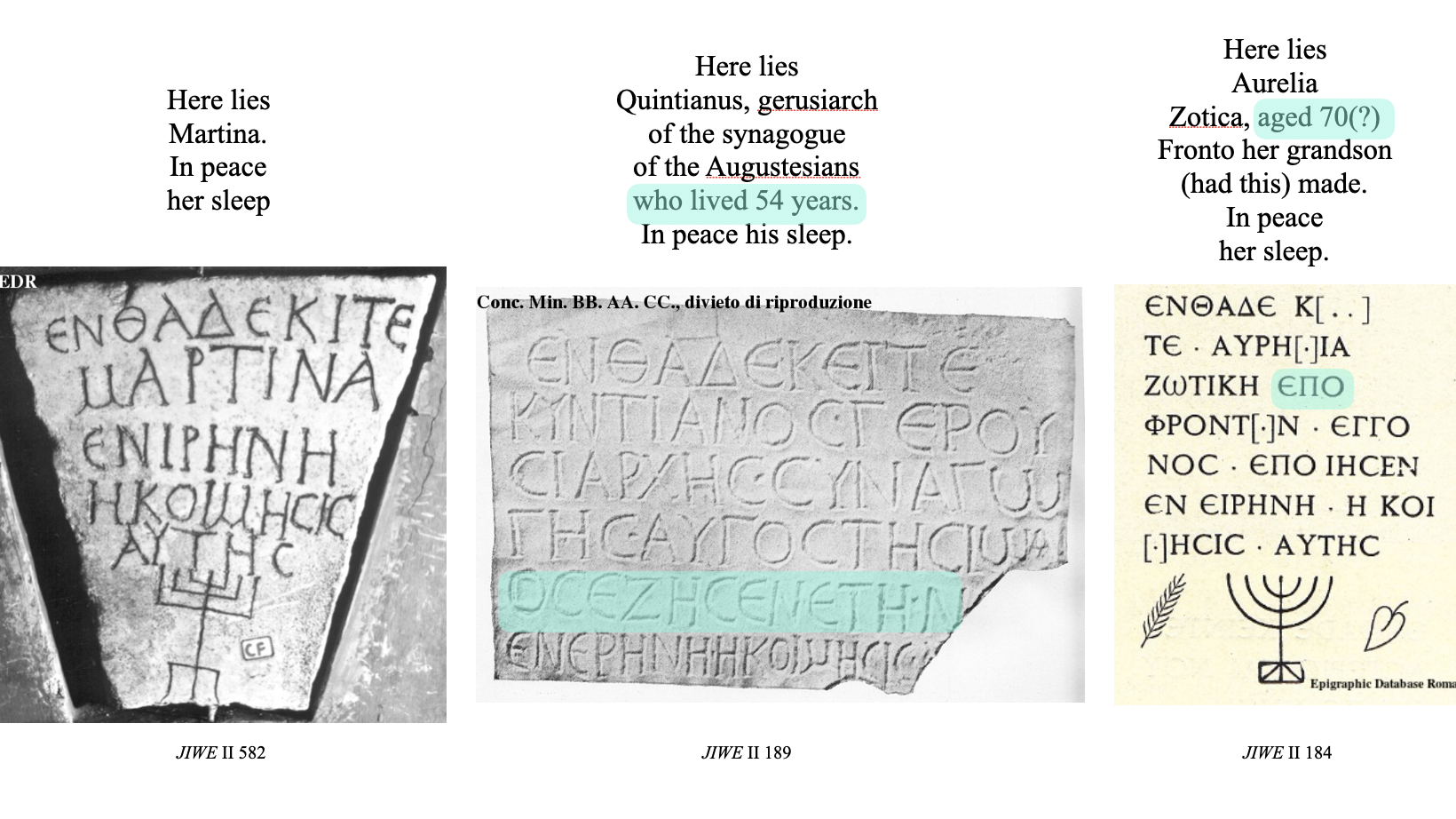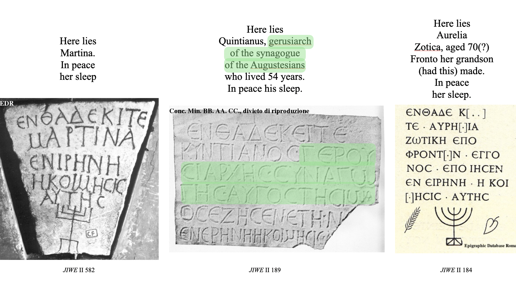 These same elements of medieval Latin Christian inscriptions also apply to ancient Greek Jewish inscriptions. Where we have looked at medieval Christian inscriptions from south-eastern Gaul as an example, we will now consider ancient Jewish inscriptions from the city of Rome.