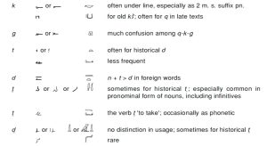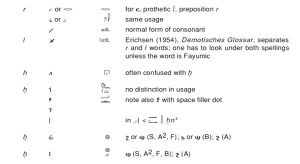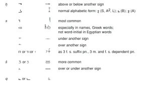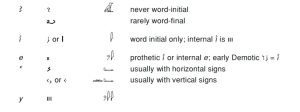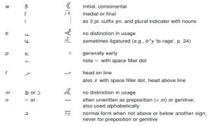 To start with deciphering Demotic is to learn all of the signs which denote one single consonant in Demotic. These signs are used in all stages of Demotic and are thus very important. In advance, it should be noted that certain letters have a different shape due to their position within a word or surrounding signs. Furthermore, the interested reader will notice that there are indeed five distinct phonemes for the h-sound as well as five distinct phonemes for dentals (although d is hardly used in Demotic any more). The following excerpts have been taken from Johnson's Introductory Grammar (pages 2-4). They list from left to right the letter of transliteration, the Demotic sign, its hieroglyphic predecessor as well as additional commentary.