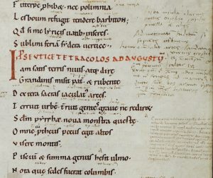 In der obigen Abbildung lässt sich erkennen, dass mehrere unterschiedliche Schreiber beteiligt waren. Die oberen Marginalglossen unterscheiden sich in der Schrift deutlich von den unteren. In der Paläographie spricht man davon, dass sich unterschiedliche Hände klar voneinander trennen lassen. Bei großem zeitlichen Abständen lassen sich die Hände über die unterschiedlichen Schriften gut differenzieren; daneben gibt es weitere Kriterien, die gerade dann von Bedeutung sind, wenn die Schreiber ähnliche Schriften verwendet haben: der Neigungswinkel der Schriftschäfte im Verhältnis zur Grundlinie einer Zeile, Höhe und Breite einzelner Buchstaben sowie die individuellen Ausprägungen der Federzüge (Schneider 1999, S. 98).
