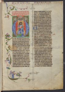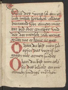 Berlin, SBB, Ms. germ. oct. 364, fol. 5r; Gebetsbuch im Oktavformat (Digitalisat: http://resolver.staatsbibliothek-berlin.de/SBB000059AD00000016 [09.10.2025])Wenzelbibel im Folioformat; Wien, ÖNB, Cod. 2759, fol. 1r (Digitalisat: https://data.onb.ac.at/rep/131D8987 [09.10.2025]) Im Fall von Pergament sind die Maximalmaße eines Blattes abhängig von der Größe des verarbeiteten Tieres. Als durchschnittlich kann ein Umfang von 50–55 × 70–80 cm angenommen werden.[4] Hinsichtlich des Papieres ist die Größe des zugrundeliegenden Ausgangsbogens abhängig von den Maßen des verwendeten Schöpfsiebes, die regional, aber auch individuell voneinander abweichen können. Verbreitet ist jedoch die sogenannte Kanzleigröße, deren Ausgangsbogen in etwa die Maße 32 × 45 cm aufweist.[5] Zu unterscheiden von der Größe eines solchen Ausgangsbogens ist das jeweilige Format des entstehenden Codex. So entsteht durch das einmalige mittige Falten des Bogens ein Doppelblatt, das als Folioformat bezeichnet wird. Durch zweimaliges Falten entstehen zwei Doppelblätter im Quartformat, durch dreimaliges Falten vier Doppelblätter im Oktavformat und so weiter. Die Entscheidung, welches Format für einen Codex gewählt wird, kann dabei Aufschluss über den funktionalen Status desselben geben. Während Codices im Folio-Großformat unter anderem für repräsentative Prachthandschriften Verwendung fanden, schienen kleinformatige Oktavhandschriften eher für alltäglichere Gebrauchstexte – bspw. für ein Gebetsbuch zur individuellen Andacht – geeignet.